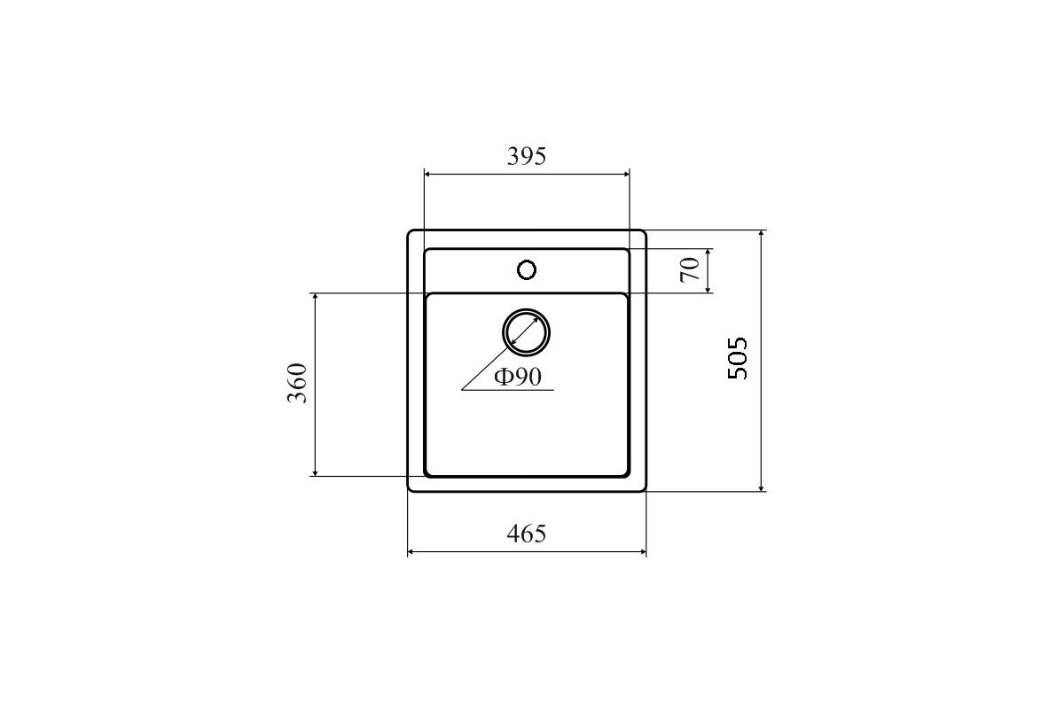 Стильная прямоугольная мойка. Глубина чаши 21 см. Ширина установочной тумбы не менее 45 см. Вырез под мойку 43,5х47,5 см. Установка сверху. Имеется одно сквозное отверстие и два намеченных. Сливная арматура и сифон в комплекте.
